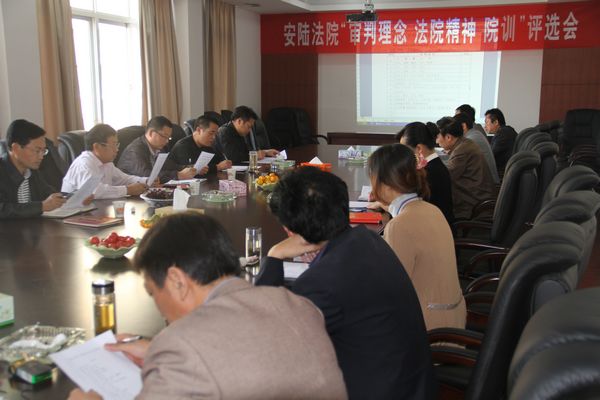 10月18日下午3点,安陆市人民法院在三楼会议室召开“审判理念”“法院精神”“院训”评审会。会议由法院政治处主任辛裕泰主持。参加会议的有市委副书记李一三、市文联主席易千元、市政协专委会主任朱绍斌、市广电局局长梁银宗、市一中校长孙宁、市政法委调研科科长杨俊杰、法院干警代表杨立波及办公室有关人员。