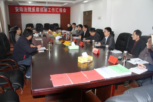 10月25日上午,安陆市市委常委、纪委书记陈作义、张浩芬主任、李孝主任、陈克柱主任一行四人到安陆法院检查指导反腐倡廉工作,安陆法院党组书记、院长刘学刚代表安陆法院从思想、审判、待遇、形象等方面的反腐倡廉工作向与会领导作了工作汇报。最后,陈作义书记作了指导性发言,他强调:要加强领导,落实责任,强化管理,建全网络管理体系,并对安陆法院的反腐倡廉工作给予了充分的肯定