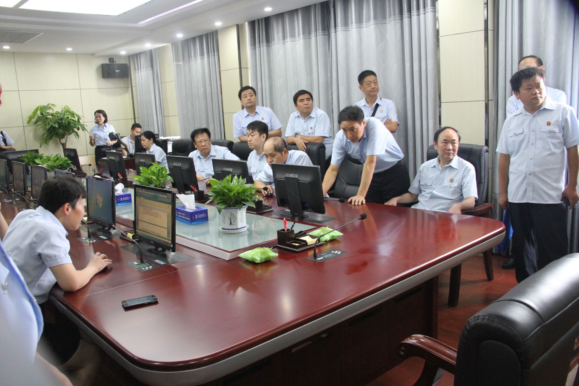 李院长一行参观了我院立案信访接待中心、数字化法庭、数字化审委会、电子荣誉室等场所。观摩了科技法庭庭审、文书批注系统、数字化审委会等演示。