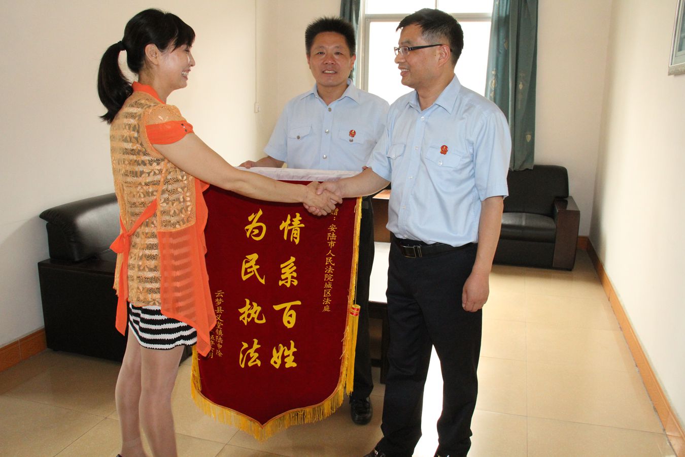 6月10日,云梦县义堂镇陆某的女儿将一面 “情系百姓,为民执法”的锦旗送到安陆法院城区法庭。